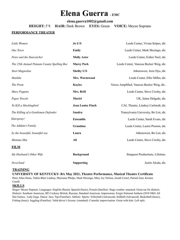 Elena Guerra, a Kentucky native, is an actress, singer, and strong mover who currently resides in Lexington. Her most recent credits include Molly Aster in Peter and the Starcatcher, Emily Webb in Our Town, Mrs. Wormwood in Matilda, and Jo U/S in Little Women with Leeds Center for the Arts. Her professional credits include Olivia U/S in Twelfth Night (Athenswest Theatre Co), Shelby U/S in Steel Magnolias (Athenswest Theatre Co), and Kaylee in the Prom (Voices Amplified).
